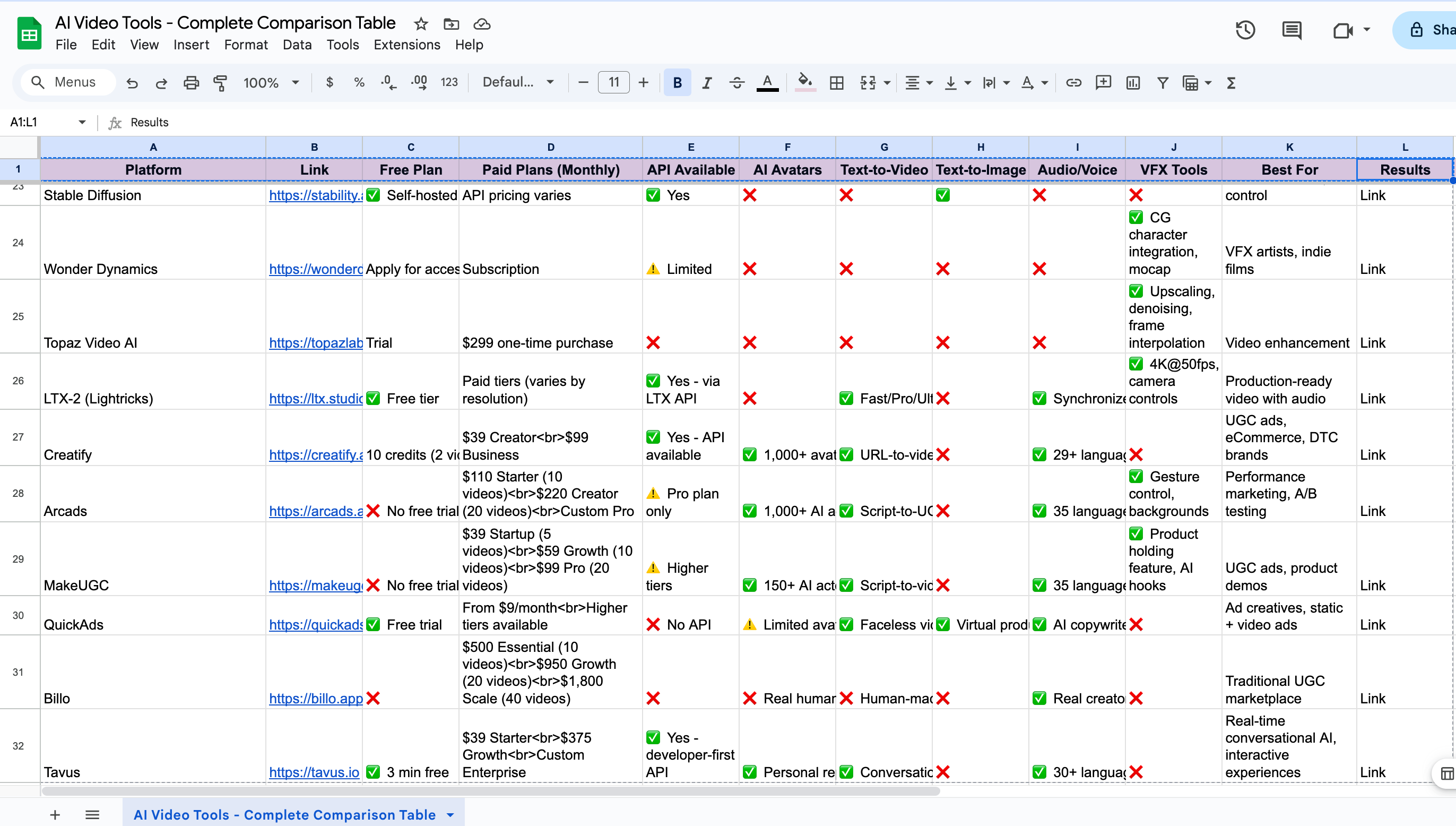 Platform | Link | Free Plan | Paid Plans | API | AI Avatars | Text‑to‑Video | Text‑to‑Image | Audio | VFX | Best For | Results